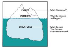 Here is a simple model depicting the relationship among events, patterns – and the structures (below the water line) that create an environment in which these patterns persist (even when they may not be in our best interest). If we apply the iceberg tool to this particular food recall, we can see that: