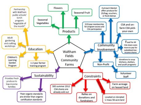 One of the simple systems tools I teach is the Mind Map, which is a visual representation of the multiple components of a complex system like a farm. Students majoring in Sustainable Food and Farming are introduced to this tool in several of their classes and most find it useful as a means of taking notes, planning projects, of just telling someone else about a farm they have visited. Here is an example of a mind map of a community farm which uses land owned by UMass in Eastern Massachusetts.