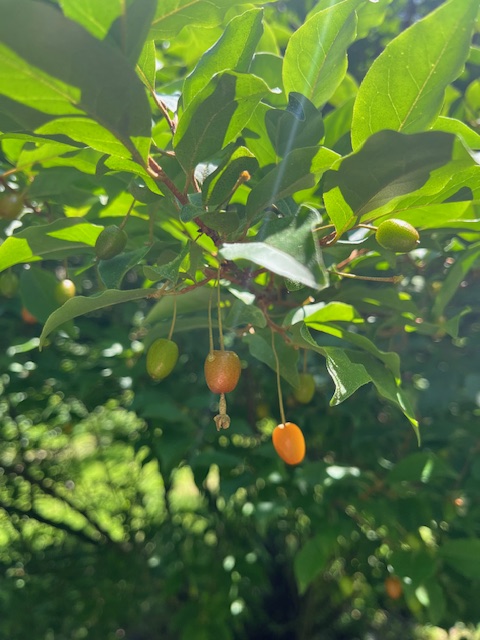 The first edible fruit come from the goumi berries at the end of one of the rows of blueberries. Its the large shrub. Tons of tart berries on this one in mid-June. But get them before the birds do!