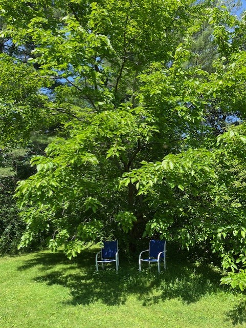 The first edible plant you will see is the mulberry tree with two chairs underneath. I make mulberry muffins from these fruit when they begin to ripen and turn red.