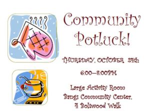 Grow Food Amherst has organized a community potluck on Food Day, October 24. This local organization has invited all members of the community to gather for a potluck meal to celebrate National Food Day in the Large Activity Room of the Bangs Community Center. Everyone is asked to bring a dish to share prepared with items from their garden, CSA, local farm or local food store (as much as possible), their own plate and utensils, and an index card with a list of ingredients for those with food allergies.